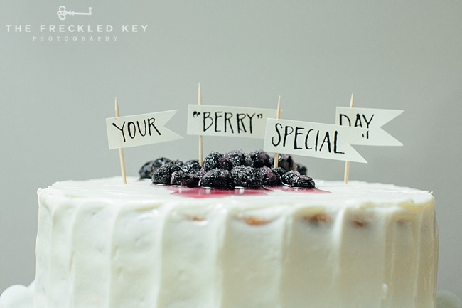 For the top of the cake, I took some frozen blueberries out of the freezer, ran them under warm water until they defrosted, then laid them out to semi-dry on some paper towels. Once they weren’t drenched in water, I poured some sugar in a bowl and rolled the blueberries around in the sugar until there was a thick layer of glittering sugar on each blueberry, then dumped them on top of the cake. Because the blueberries were still a little wet, the sugar caused them to eventually seep this beautiful purple syrup on top of the cake that slowly trickled over the sides of the cake, which was a nice (albeit unplanned) touch!